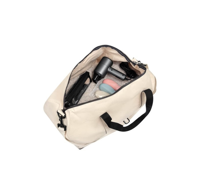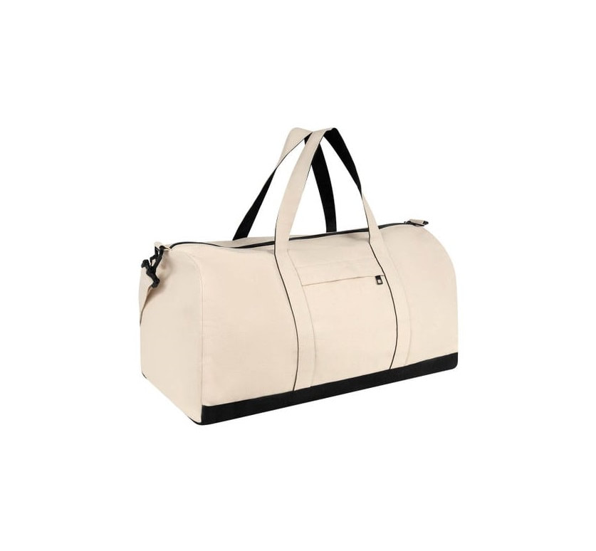 Maleta ecológica fabricada con algodón reciclado. Cuenta con un compartimento principal con cierre y dos asas para hombro.