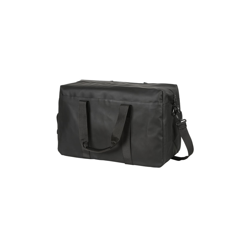 Bolso de viaje fabricado en poliéster, con bolsillo frontal e interno con cierre, bolsillos internos de malla, asas superiores con broche, correa para hombro ajustable y banda para fácil transporte.