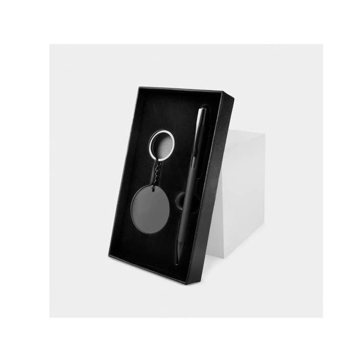 Set de regalo de 2 piezas. Contiene bolígrafo metálico con terminado rubber y mecanismo pulsador, además de un llavero metálico con terminado suave al tacto, que al grabarlo con láser, revela un efecto espejo que lo hace único y distintivo. Incluye caja de regalo.
