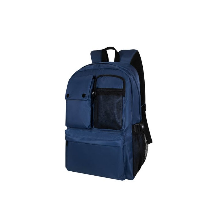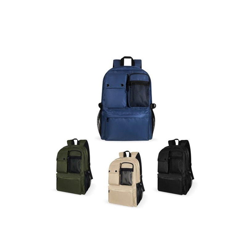 Mochila con amplia bolsa principal con compartimento interno para laptop de hasta 15” y dos bolsas internas. Cuenta con 3 bolsillos frontales, dos de ellos con cierre y uno con sistema de botones. Tiene un par de ajustadores expandibles y laterales de malla.