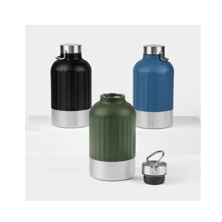 Termo doble pared. Cerrado al vacío. Pared interna y externa de acero inoxidable. Tapa con sistema de rosca compuesta de plástico y acero inoxidable. Incluye un asa metálica para transportar con mayor comodidad. Su diseño bitono, combina color y modernidad, mientras que su textura metálica con patrón de líneas verticales, le da un toque original y vanguardista. Mantiene la temperatura caliente por 6 hrs y temperatura fría por 8 hrs. Capacidad 23 Oz. Base de 9 cm de diámetro. Incluye caja individual.