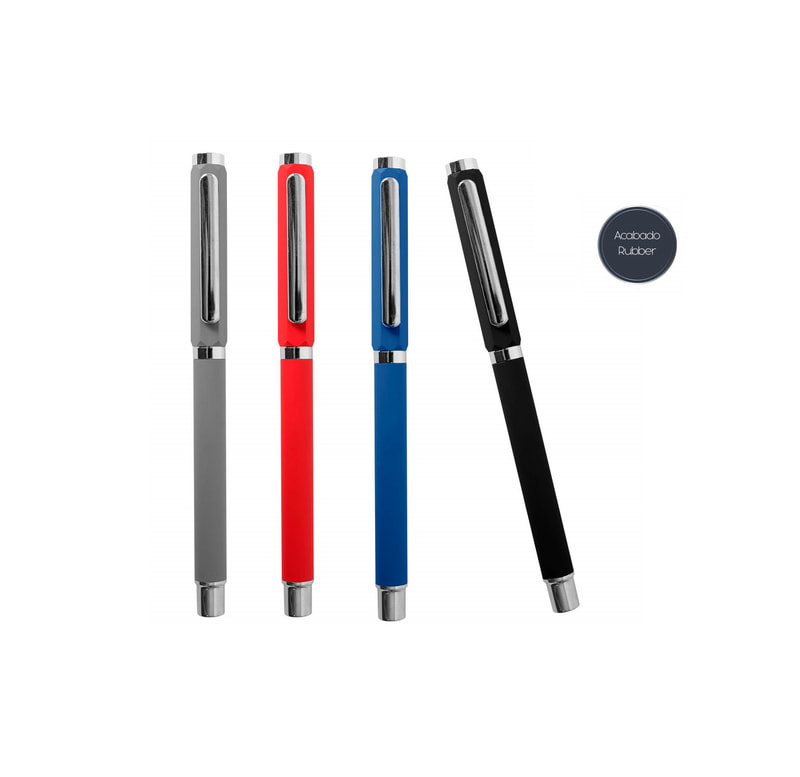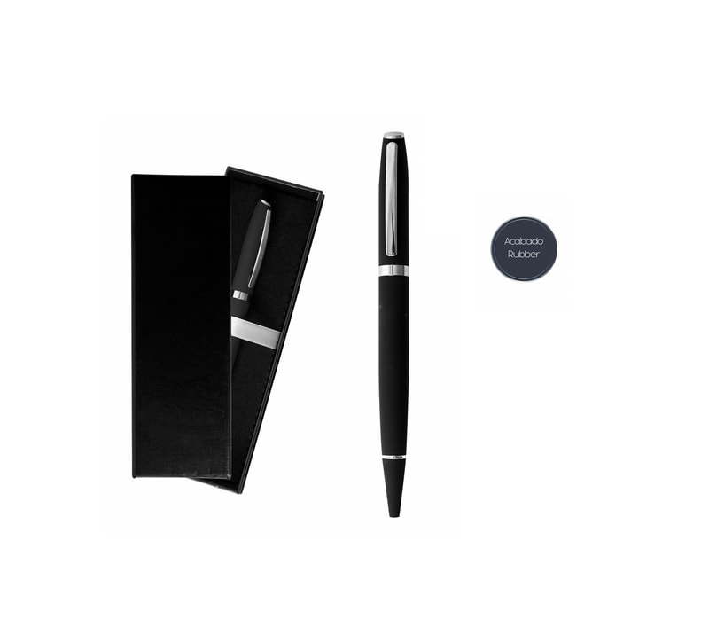 Bolígrafo metálico de cuerpo cuadrangular con tapón que cierra a presión. Detalles color cromo. Suave textura ahulada. Escritura de alto desempeño debido a su respuesto japonés tipo roller ( a elegir en tinta negra o azul). Incluye estuche individual.