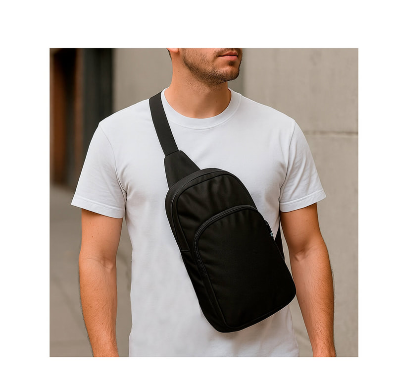 Bolsa de hombro con compartimento principal, bolsa frontal con cierre de imán y correa ajustable.