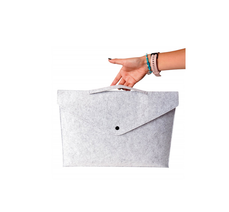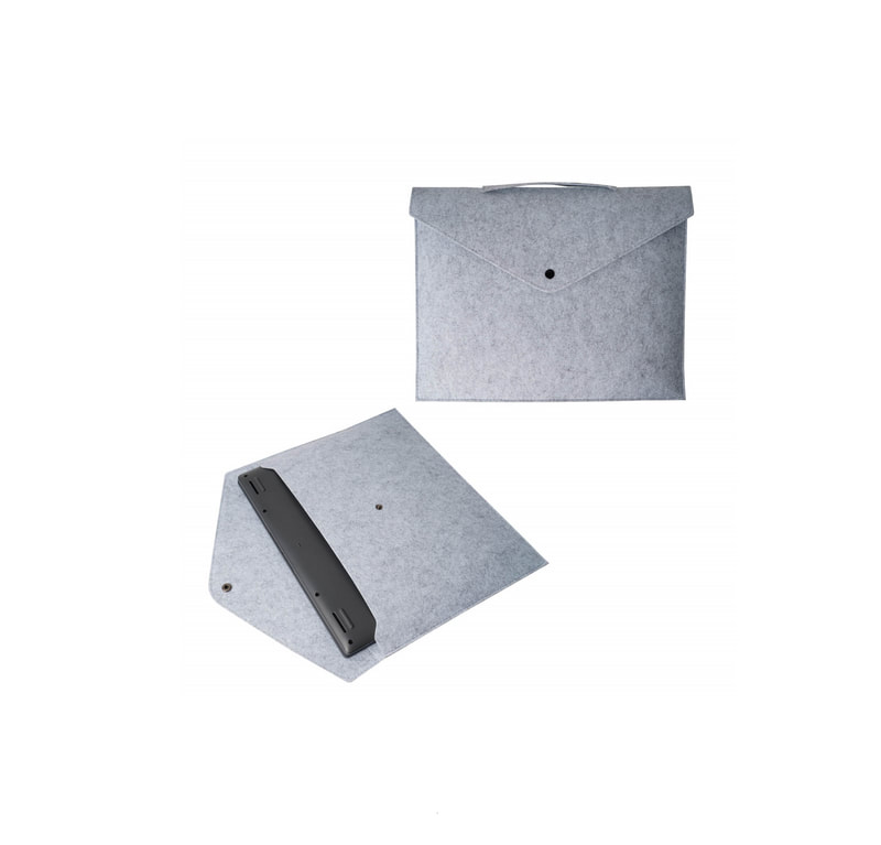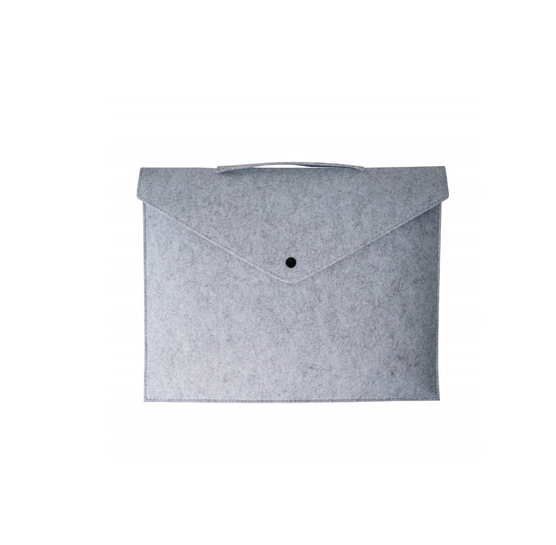 Portafolio de fieltro con un compartimento principal para laptop de hasta 15" con broche y asas.