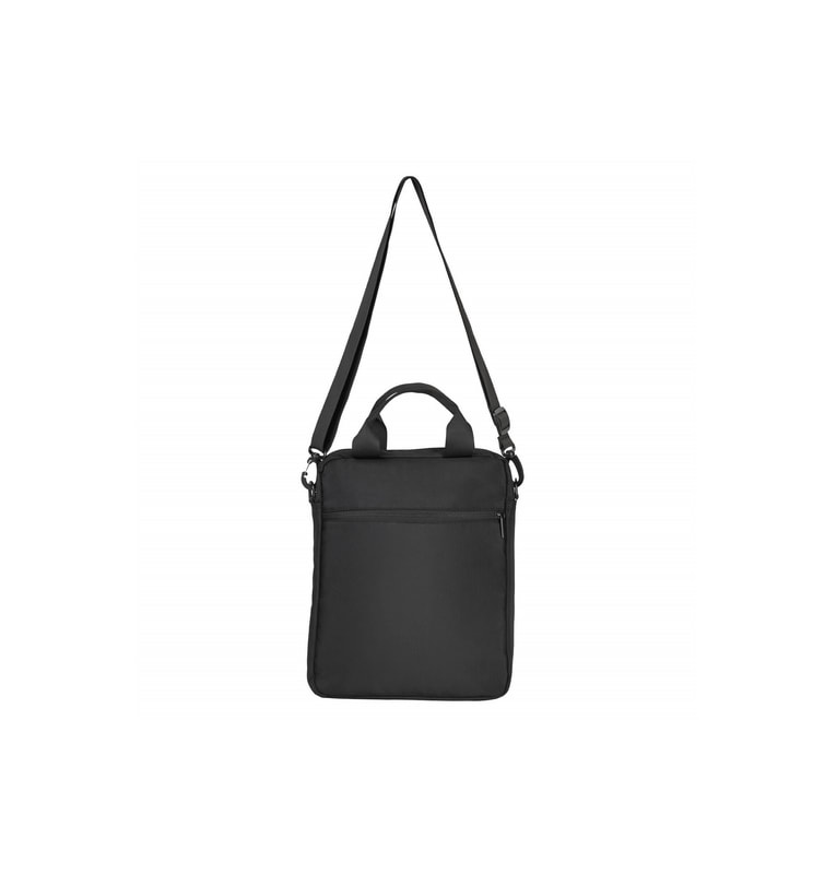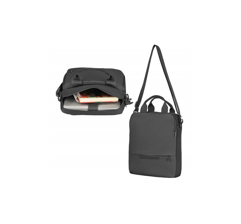 Medidas 38 x 27,5 x 7 cm. Poliester 600D. Capacidad 7 litros. Maletín porta notebook con dos bolsillos con cierre en el exterior. Dos compartimentos, el principal con espacio porta notebook y el segundo con organizador de bolígrafos y bolsillo. Correa desmontable con hombrera de tela acolchada con trabas y regulador metálico.