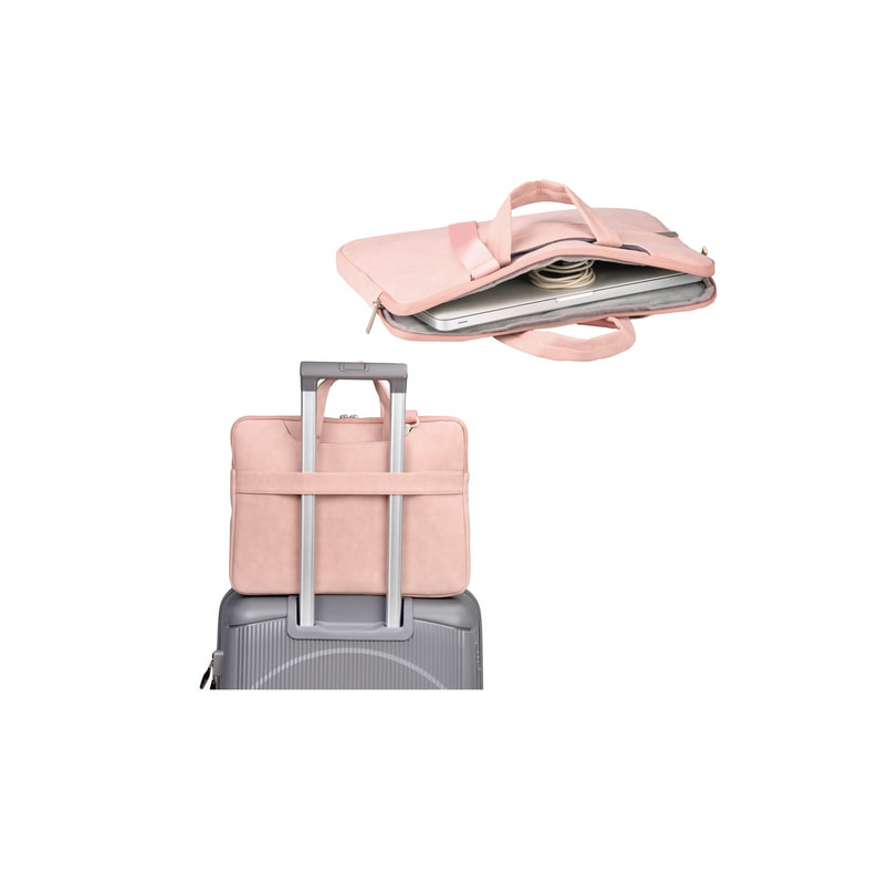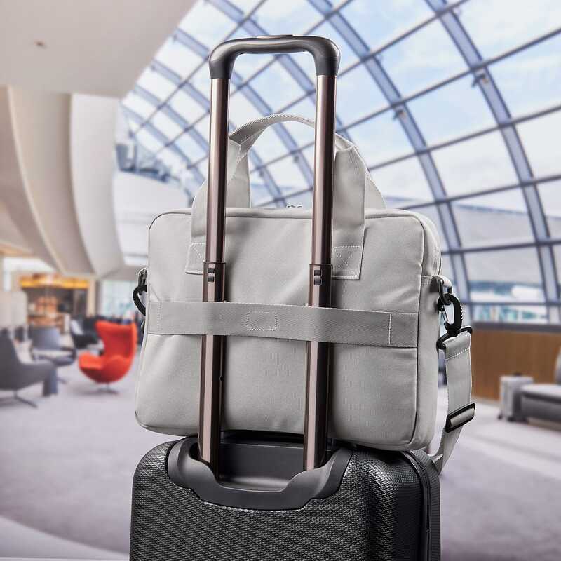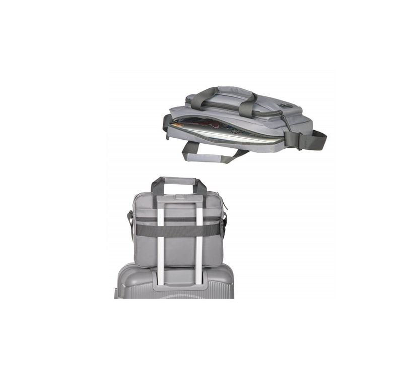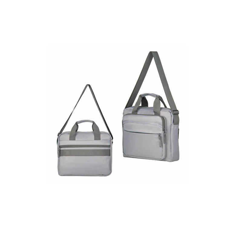 Portafolio con compartimento principal afelpado para laptop de hasta 15", dos bolsillos para guardar las asas, bolsa frontal con cierre, banda carry-on y correa ajustable.