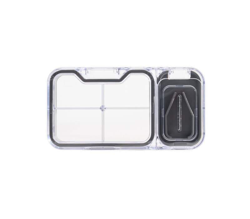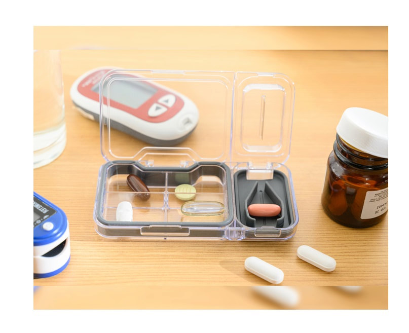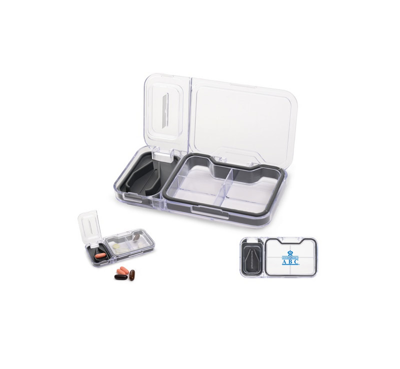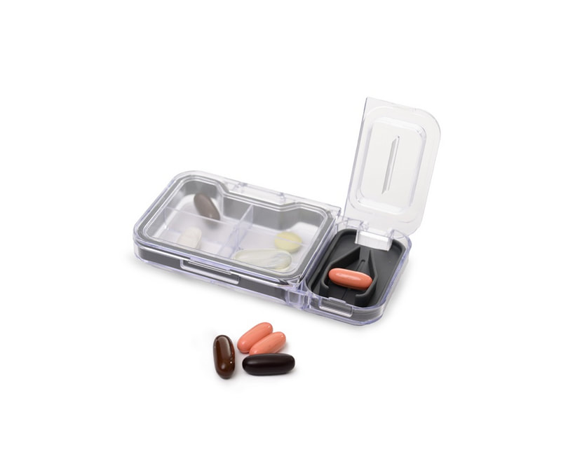Pastillero con 4 divisiones para píldoras, pastillas y tabletas; incluye cortapastillas independiente.