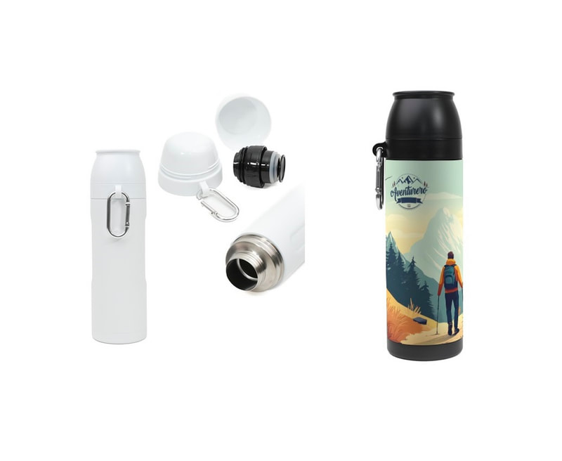 Termo sublimable de acero inoxidable y doble pared insulado al vacío. Cuenta con tapa de rosca con asa de plástico para sujetarlo fácilmente.ç