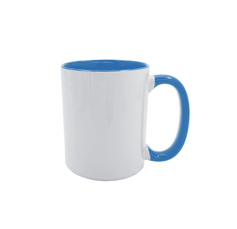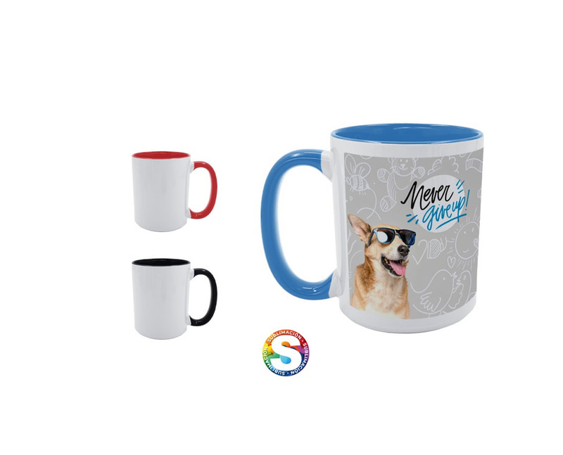 Taza blanca mate de arcilla para sublimación, con base y media asa de color. CAP. 325 ml. (11 OZ). Venta en múltiplos de 12.